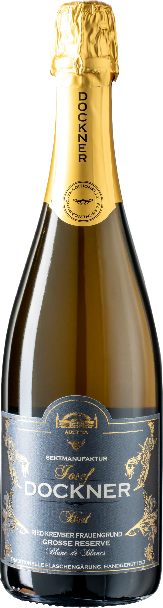 Chardonnay, Weißburgunder, Grauburgunder. Leuchtendes Goldgelb, angenehm weiches Mousseux, gelbe Tropenfrucht, zarte Briochenote mit leichten Tanninen vom großen Holzfass, saftig, elegant, großes Reifepontential, angenehme Fruchtsüße, internationaler Schaumwein.